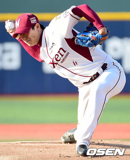 넥센 선발 김대우가 힘차게 공을 뿌리고 있다.