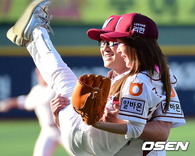 시구-시타자로 나선 배우 박준금이 방송인 지상렬에게 번쩍 안겨 그라운드를 나서고 있다.