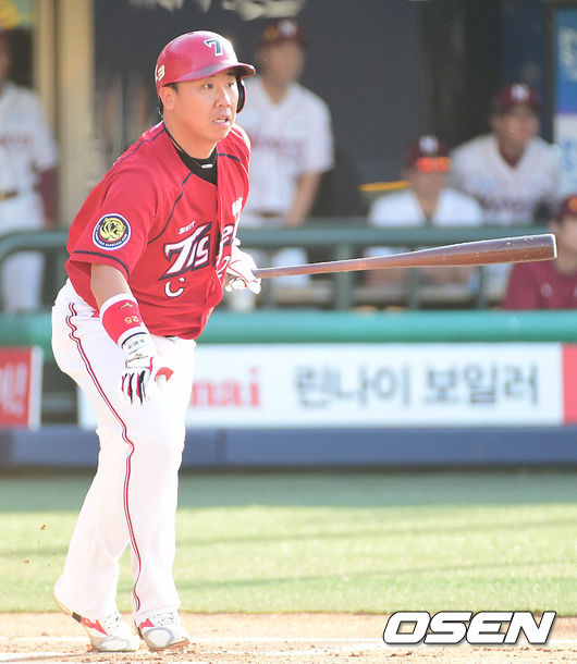 1회초 KIA 공격 1사 2루 상황 이범호가 우익수 앞에 떨어지는 1타점 적시 2루타를 날리고 타구를 바라보고 있다.