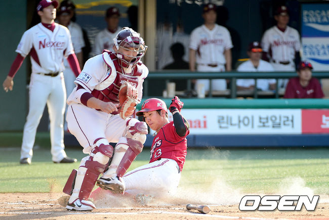1회초 KIA 공격 1사 2루 상황 이범호의 선제 1타점 우익수 앞 2루타 때 주자 이대형이 홈까지 내달려 세이프 되고 있다.