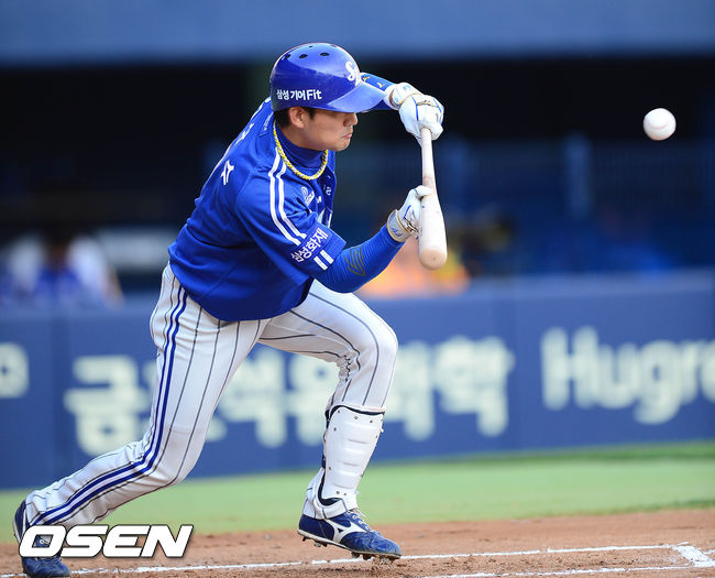 2회초 1사 주자1, 3루 김상수가 기습 1타점 희생 번트를 치고 있다.