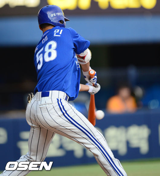 2회초 1사 주자 3루 상황 삼성 박해민이 3루 주자 박석민을 불러들이는 1타점 적시타를 치고 있다.