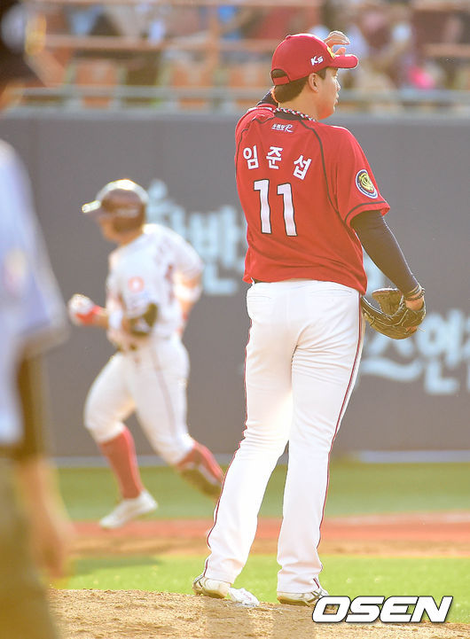 2회말 넥센 공격 선두타자로 나선 윤석민에게 동점 우중간 솔로포를 허용한 KIA 선발 임준섭이 아쉬워하고 있다.