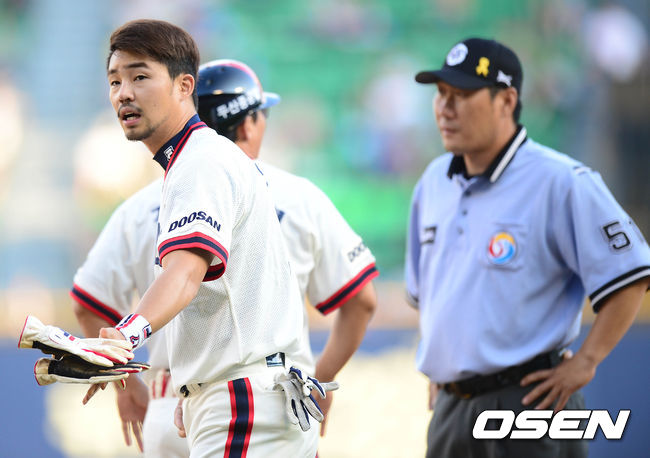 2회말 2사 주자 1루 상황 삼성 배영수의 견제에 1루 주자 오재원이 아웃당하자 불만을 표하고 있다.