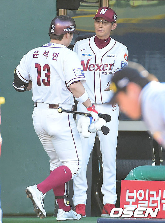 2회말 넥센 공격 선두타자로 나선 윤석민이 동점 우중간 솔로포를 날리고 염경엽 감독과 인사를 나누고 있다.