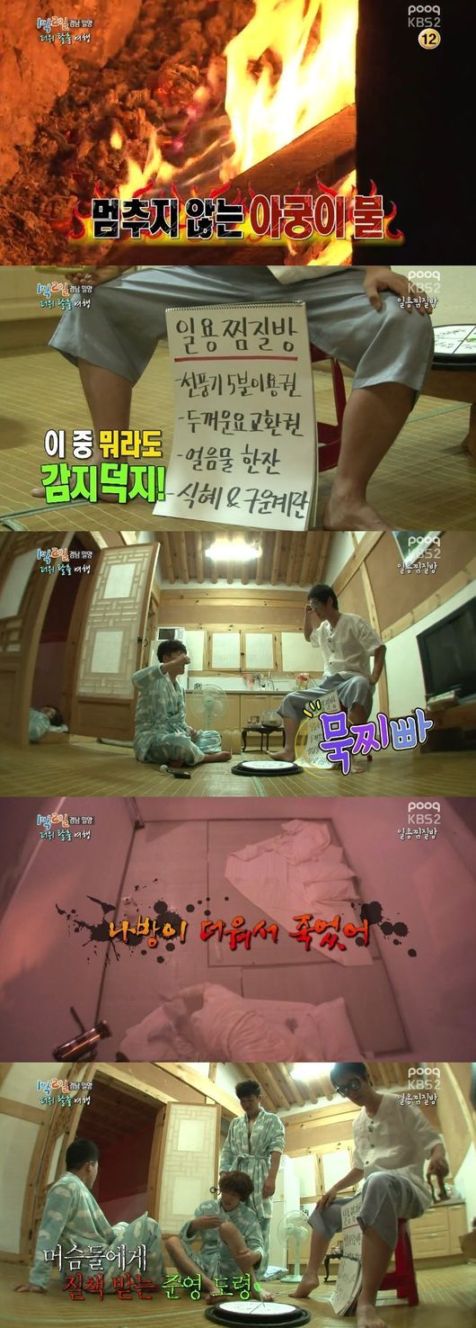 이후 방 밖에서 제작진이 게임을 이용해 더위를 나게 해줄 아이템을 준다는 것을 안 김종민은 제작진과 묵찌빠를 했지만 1초 만에 패했다. 이후 정준영도 ‘참참참’으로 패하고, 김준호도 역시 연달아 지며 멤버들의 고생은 계속 됐다. 방은 너무 더워 날아다니던 나방이 떨어져 죽을 온도였다.