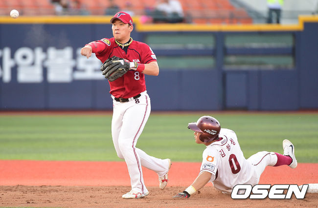 2회말 넥센 공격 1사 1, 3루 상황 허도환의 병살타 때 KIA 2루수 안치홍이 김하성을 포스아웃 시킨 뒤 1루로 송구하고 있다.