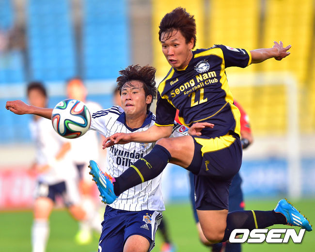 6일 오후 경기도 성남 탄천종합운동장서 열린 2014 현대오일뱅크 K리그 클래식 성남 FC와 울산 현대의 경기, 전반 성남 이종원과 울산 서용덕이 볼을 다투고 있다