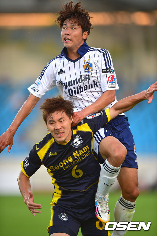 6일 오후 경기도 성남 탄천종합운동장서 열린 2014 현대오일뱅크 K리그 클래식 성남 FC와 울산 현대의 경기, 전반 울산 서용덕과 성남 박진포가 몸싸움을 펼치고 있다.