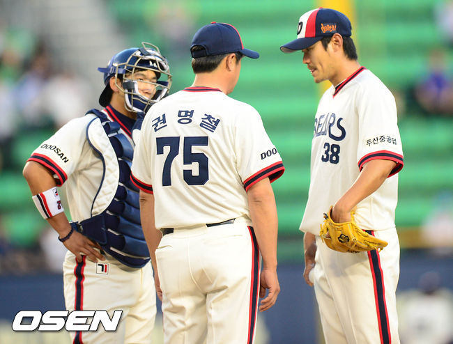 6회초 무사 두산 베어스 노경은이 볼넷과 2루타로 주자를 모으자 권명철 투수코치가 마운드를 방문하고 있다.