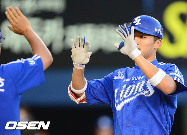 6회초 2사 주자1루 상황 삼성 박해민이 투런포를 치고 김평호 코치와 기쁨을 나누고 있다.