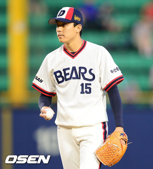 7회초 두산 선발 투수 노경은이 오현택으로 교체되어 오현택이 마운드에 오르고 있다.