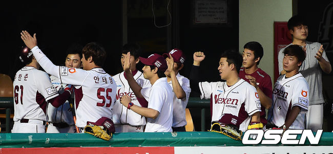 5회말 넥센 공격 1사 1, 2루 상황 유한준이 역전 좌중월 스리런포를 날리고 홈을 밟은 뒤 더그아웃 동료들과 인사를 나누고 있다.