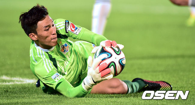6일 오후 경기도 성남 탄천종합운동장서 열린 2014 현대오일뱅크 K리그 클래식 성남 FC와 울산 현대의 경기, 후반 울산 김승규가 몸날려 공을 잡아내고 있다.