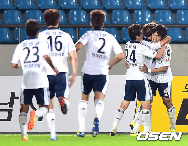 6일 오후 경기도 성남 탄천종합운동장서 열린 2014 현대오일뱅크 K리그 클래식 성남 FC와 울산 현대의 경기, 후반 울산 유준수가 선취골을 넣고 동료들과 기뻐하고 있다,