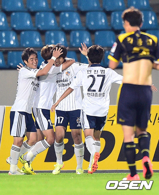 6일 오후 경기도 성남 탄천종합운동장서 열린 2014 현대오일뱅크 K리그 클래식 성남 FC와 울산 현대의 경기, 후반 울산 유준수가 선취골을 넣고 동료들과 기뻐하고 있다.