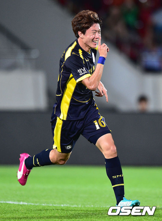 6일 오후 경기도 성남 탄천종합운동장서 열린 2014 현대오일뱅크 K리그 클래식 성남 FC와 울산 현대의 경기, 후반 성남 황의조가 동점골을 넣고 환호하고 있다.