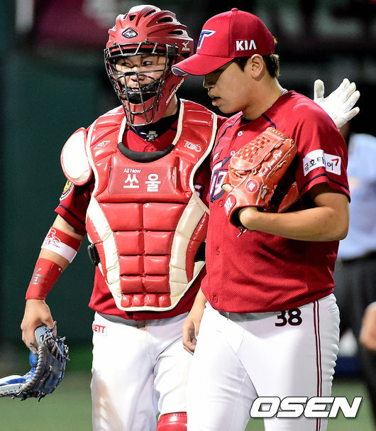7회말 넥센 공격을 삼자 범퇴로 막아낸 KIA 투수 박준표와 포수 차일목이 대화를 나누며 더그아웃으로 들어오고 있다.