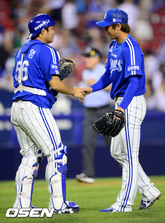 마무리로 나온 삼성 투수 임창용과 포수 이지영이 기쁨을 나누고 있다./greenfield@osen.co.kr