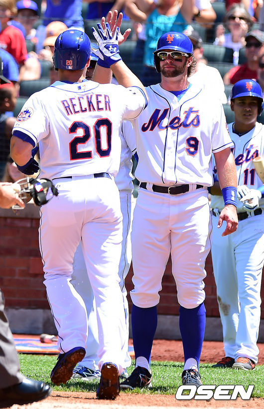 1회말 2사 2,3루 뉴욕 메츠 렉커가 좌측 담장을 넘기는 스리런 홈런을 때린 뒤 동료들과 기뻐하고 있다.