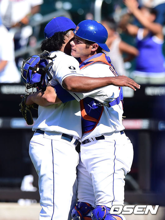 승리를 거둔 뉴욕 메츠 메히아와 렉커가 포옹을 하고 있다./youngrae@osen.co.kr