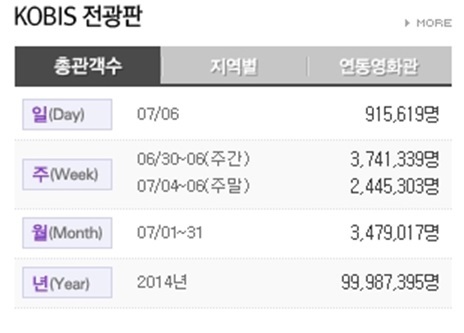 KOBIS 전광판에 따르면 이날 오전 2014년 총 관객수는 99,987,395명을 기록 중이다. 이로써 총 극장 관객수는 이날 공식적으로 1억명을 돌파하게 된다.