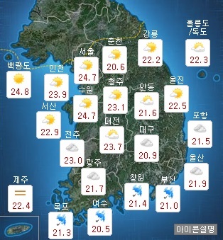 남부 지방은 오전부터 대체로 흐리고 중부 지방은 구름이 많이 낀 날씨를 보이고 있다. 전라남북도와 경상남도에서 산발적으로 약한 빗방울이 떨어지는 곳이 있다. 또한 남부 지방은 대체로 흐린 가운데 기온이 평년과 비슷하거나 조금 낮겠다.