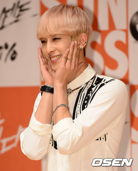 백퍼센트 쇼케이스에 앞 서 포토타임 때 창범이 꽃미모를 자랑하는 포즈를 취하고 있다.
