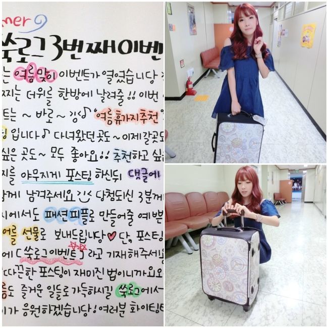 또한 김지숙은 이벤트에 참여하는 팬, 이웃 블로거를 위해 당첨 선물로 캐리어를 준비 했다. 그가 캐리어를 선택한 이유는 이벤트 당첨자들이 휴가지에서 ‘패션피플’로 거듭날 수 있도록 하기 위한 것이다. 김지숙만의 ‘깨알 센스’와 세심한 배려가 돋보이는 부분이다. 김지숙은 직접 캐리어를 활용한 코믹 인증사진을 함께 남겨 이벤트 참여를 독려하기도 했다.