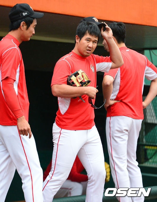 7일 오후 부산 사직구장에서 열린 2014 한국야쿠르트 세븐 프로야구 롯데 자이언츠와 SK 와이번스의 경기전 부상 복귀한 SK 최정이 훈련에 나서고 있다.