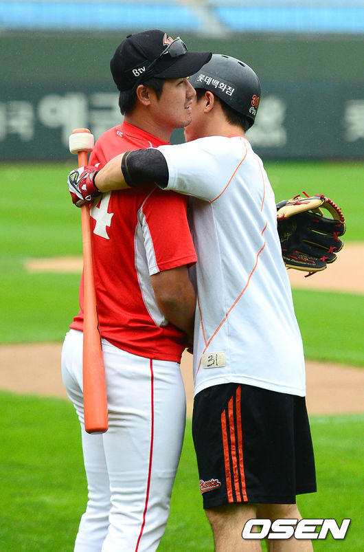 7일 오후 부산 사직구장에서 열린 2014 한국야쿠르트 세븐 프로야구 롯데 자이언츠와 SK 와이번스의 경기전 부상 복귀한 SK 최정이 롯데 손아섭과 포옹을 하고 있다