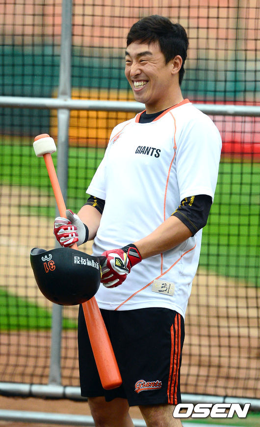 7일 오후 부산 사직구장에서 열린 2014 한국야쿠르트 세븐 프로야구 롯데 자이언츠와 SK 와이번스의 경기전 롯데 손아섭이 부상 복귀한 최정을 보며 미소 짓고 있다