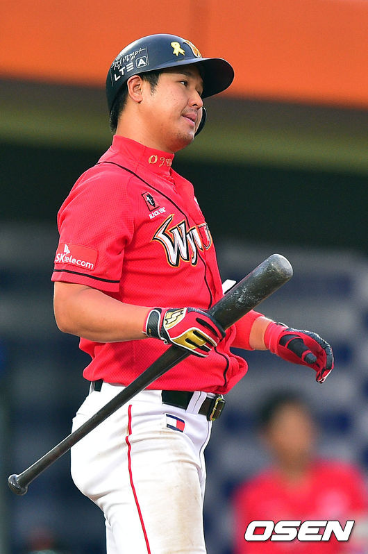 7일 오후 부산 사직구장에서 열린 2014 한국야쿠르트 세븐 프로야구 롯데 자이언츠와 SK 와이번스의 경기, 3회초 헛스윙 삼진아웃된 SK 최정이 아쉬워하고 있다