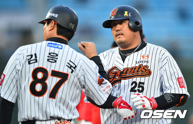 7일 오후 부산 사직구장에서 열린 2014 한국야쿠르트 세븐 프로야구 롯데 자이언츠와 SK 와이번스의 경기, 3회말 2사 1,3루 롯데 최준석이 선취 1타점 적시타를 날리고 김응국 코치와 하이파이브를 하고 있다