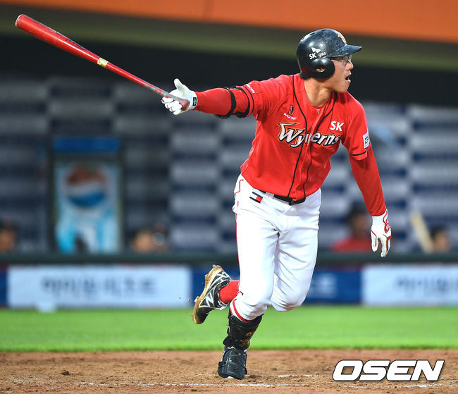 7일 오후 부산 사직구장에서 열린 2014 한국야쿠르트 세븐 프로야구 롯데 자이언츠와 SK 와이번스의 경기, 4회초 무사 3루 SK 박정권이 역전 1타점 적시타를 날리고 있다.