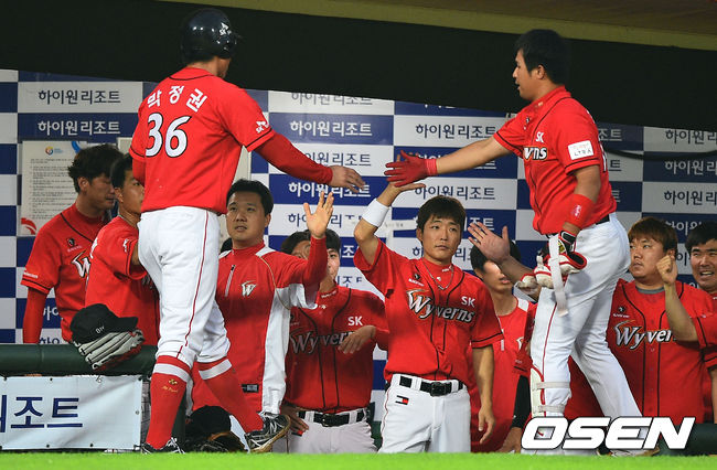 7일 오후 부산 사직구장에서 열린 2014 한국야쿠르트 세븐 프로야구 롯데 자이언츠와 SK 와이번스의 경기, 4회초 1사 2,3루 SK 김강민의 2타점 적시타때 3루 주자 박정권이 홈을 밟은 뒤 동료들의 축하를 받고 있다.