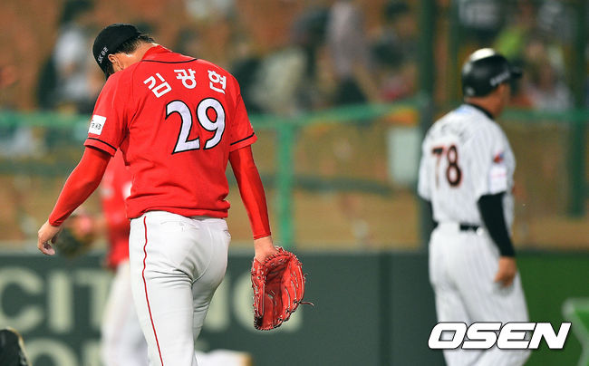 7일 오후 부산 사직구장에서 열린 2014 한국야쿠르트 세븐 프로야구 롯데 자이언츠와 SK 와이번스의 경기, 5회말 2실점 허용한 SK 선발투수 김광현이 고개를 숙인채 그라운드를 빠져나가고 있다.