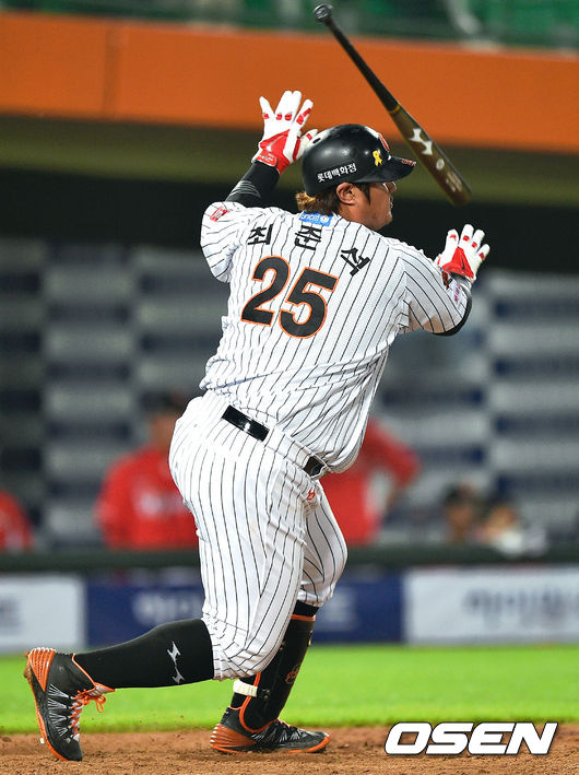 7일 오후 부산 사직구장에서 열린 2014 한국야쿠르트 세븐 프로야구 롯데 자이언츠와 SK 와이번스의 경기, 5회말 1사 만루 롯데 최준석이 2타점 적시타를 날리고 있다.