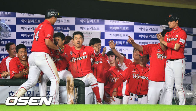 7일 오후 부산 사직구장에서 열린 2014 한국야쿠르트 세븐 프로야구 롯데 자이언츠와 SK 와이번스의 경기,8회초 SK 최정이 솔로포를 날리고 동료들의 축하를 받고 있다.