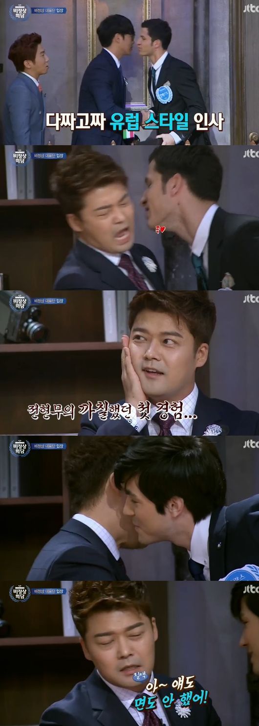 '비정상회담'의 성시경, 전현무, 유세윤이 유럽식 인사에 당황했다.