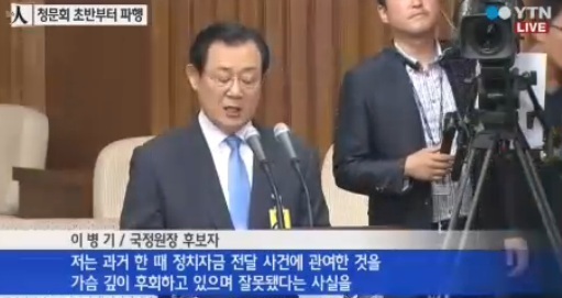 이날 이병기 국가정보원장 후보자에 대한 인사청문회에서는 과거 '한나라당 불법대선자금' 사건에 연루됐다는 점이 도마에 올랐다.