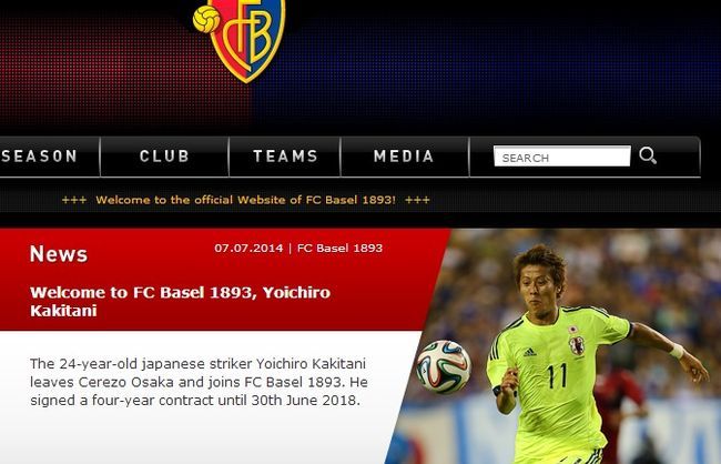 일본 축구대표팀의 공격수 가키타니 요이치로(24)가 스위스 명문 FC 바젤로 이적했다.
