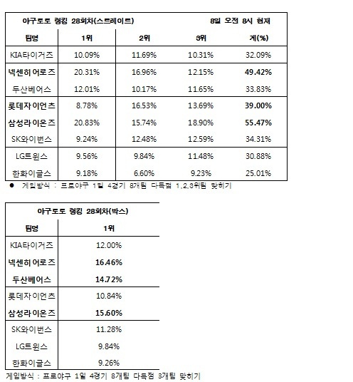 한편, 순위에 상관없이 다득점 3개팀만을 맞히는 ‘박스’ 게임에서는 넥센(16.46%)과 삼성(15.60%), 두산(14.72%)이 가장 많은 득점을 기록할 것으로 집계됐다.