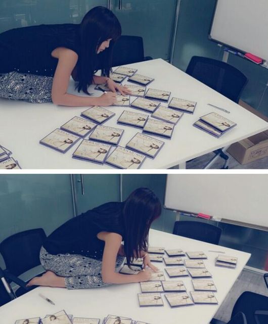공개된 사진 속 홍진영은 사인에 열중하고 있는 모습이다. 특히 홍진영은 책상에 올라가 무릎까지 꿇은 채 사인 삼매경에 빠져 보는 이들의 웃음을 자아낸다.