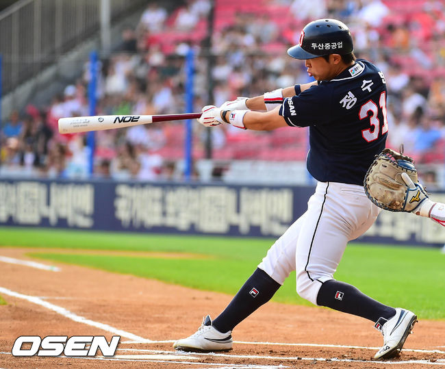 8일 오후 서울 잠실구장에서 열린 2014 한국야쿠르트 세븐 프로야구 LG 트윈스와 두산 베어스 경기, 1회초 선두타자 정수빈이 솔로포를 날리고 있다.
