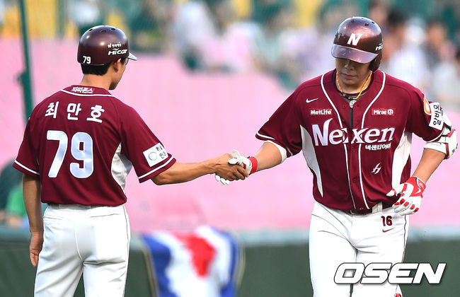8일 오후 충북 청주구장에서 열린 2014 한국야쿠르트 세븐 프로야구 한화 이글스와 넥센 히어로즈의 경기,1회초 2사 1,2루 넥센 강정호가 선취 3점 홈런을 날리고 최만호 코치와 하이파이브를 하고 있다.