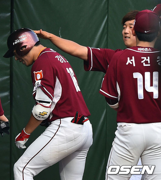 8일 오후 충북 청주구장에서 열린 2014 한국야쿠르트 세븐 프로야구 한화 이글스와 넥센 히어로즈의 경기,1회초 2사 1,2루 넥센 강정호가 선취 3점 홈런을 날린뒤 동료딀의 축하를 받고 있다.