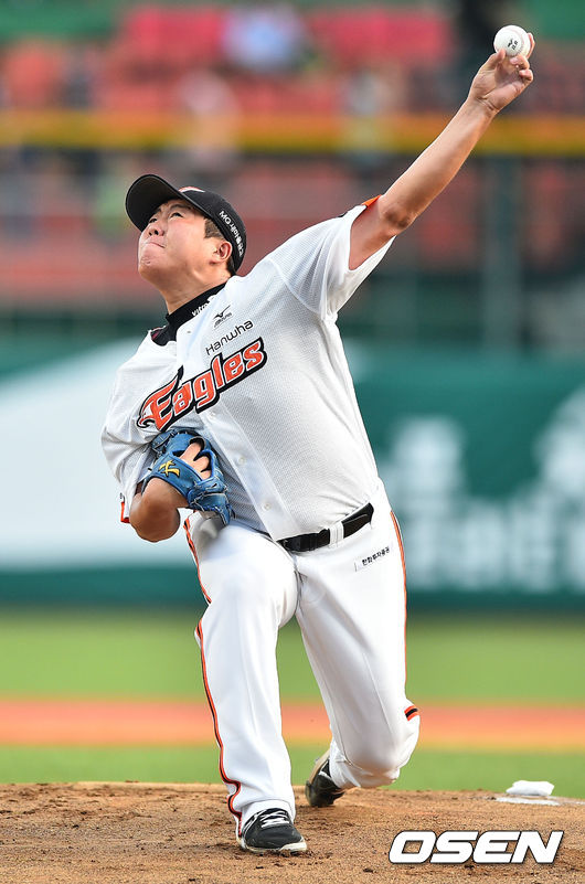 8일 오후 충북 청주구장에서 열린 2014 한국야쿠르트 세븐 프로야구 한화 이글스와 넥센 히어로즈의 경기,1회초 한화 선발투수 송창현이 역투하고 있다.