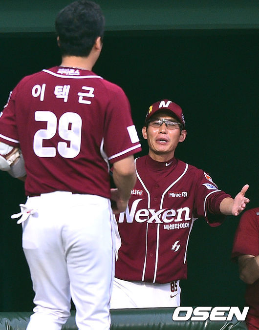 8일 오후 충북 청주구장에서 열린 2014 한국야쿠르트 세븐 프로야구 한화 이글스와 넥센 히어로즈의 경기,3회초 넥센 선두타자 이택근이 솔로홈런을 날리고 염경엽 감독의 축하를 받고 있다. 이택근의 타구는 비디오 판독 결과 홈런으로 인정됐다.