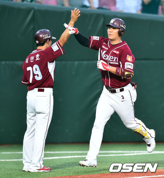 8일 오후 충북 청주구장에서 열린 2014 한국야쿠르트 세븐 프로야구 한화 이글스와 넥센 히어로즈의 경기,3회초 1사 2루 넥센 김민성이 2점 홈런을 날리고 최만호 코치와 하이파이브를 하고 있다.
